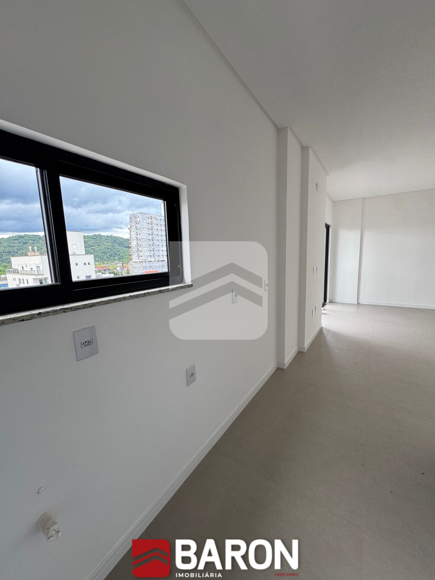 O imóvel apresenta acabamento moderno, com piso em porcelanato, teto com rebaixo em gesso, portas brancas laqueadas e esquadrias pretas, conferindo um visual contemporâneo e elegante aos ambientes.