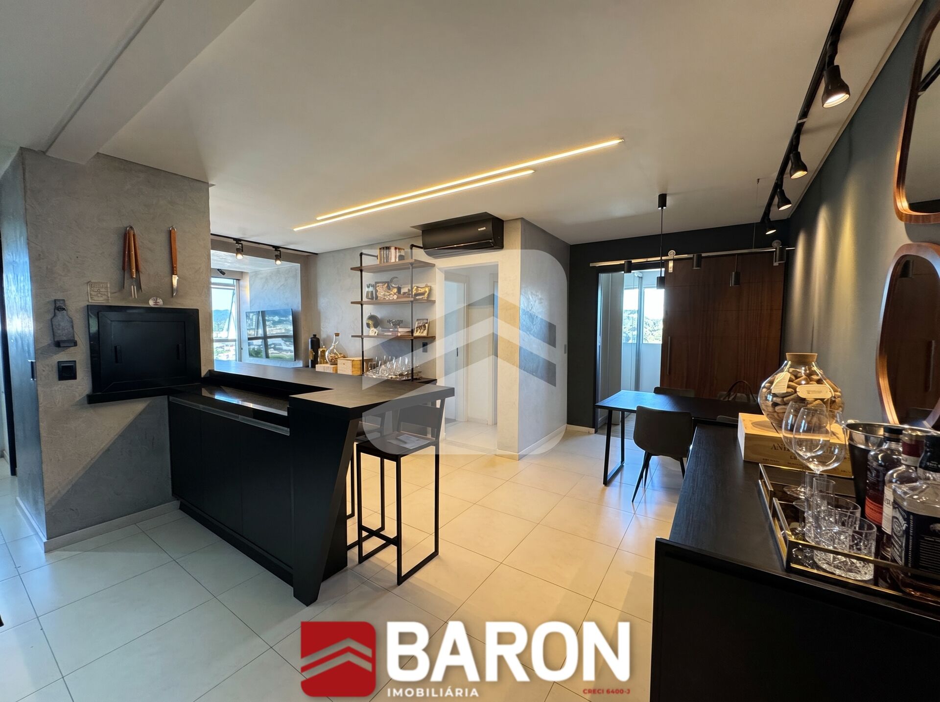 Nos acabamentos, o imóvel possui piso em porcelanato, rebaixo em gesso, paredes lisas e portas laqueadas. Entre os diferenciais, destacam-se os móveis sob medida, medidores individuais, integração dos ambientes sociais e detalhes em pele de vidro, que contribuem para a composição estética do espaço.